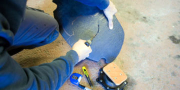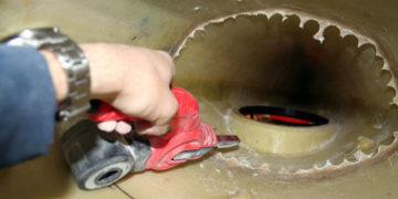 3. Eftersom det är trångt i brunnen, kapar du förmodligen det första och kanske andra skenfästet med bågfil för att slippa sprut av gnistor och damm. Men för tredje och fjärde hämtar du garanterat vinkelkapen. Det är svettigt och trångt att såga för hand i brunnen. Med vinkelkapen kan man dessutom slipa ner och jämna till det som blir kvar av fästet närmast skrovet. Jag brukar låta de inlaminerade plattorna, som den gängade tappen är svetad på, sitta kvar i skrovet.